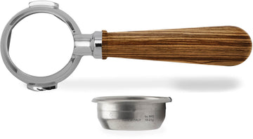 Portafiltros sin fondo con mango de madera de zebrano. Incluye filtro de acero inoxidable de 2 dosis (18-21 g), en colaboración con IMS.